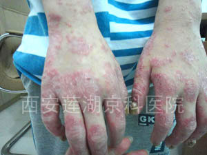 主治医生为小军进行了全面的检查,发现小军的身上的皮损发展的势头很猛烈,全身多处泛发块状皮损,色泽潮红。手部的尤为严重,已经祸及到了指关节,经过进一步检查,手部的病症已经加重为关节病型银屑病。随后组织了专家会诊,确定了详细的康复方案。