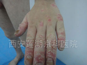 受家族遗传史影响,年幼的小军就出现了银屑病症状。小军得病之后,家人带其四处求医,希望能尽快治愈孩子的银屑病。病情不断发展,小军手部银屑病最为严重,来我院时,小军的手指关节活动严重受限,皮损颜色潮红,疼痛感让他大哭。据小军爸爸描述,自从小军身上开始出现银屑病病症,就带着他到多家医院治疗,不想让孩子跟自己一样,但是一直没有治愈,而且病情还在不断的发展。孩子的体质弱,有一段时间为了控制病情还使用激素药,可是造成病情加速发展,非常严重。